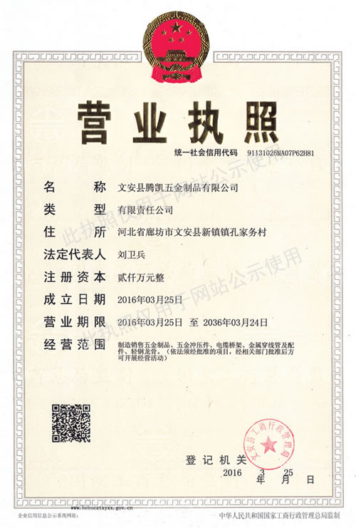 文安縣騰凱五金制品有限公司創建于2006年,是電纜橋架制造廠商,位于河北省文安縣新鎮工業區,東連京開線106國道,北接津保高速公路,背靠京九大動脈,地處北京、天津、保定三角地帶,交通便捷,通訊發達。